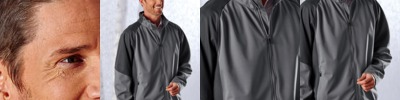 92% polyester/8% spandex bonded to 100% polyester • 9.1 oz. • 4-way stretch fabric for ease of movement • 3-layer construction • water and wind-resistant • comfort fit • bungee cord with toggles at bottom hem • zippered front pockets • zippered iPocket® • left and right inside embroidery pockets with concealed zippers • bungee zipper pulls • Sizes: S-4XL