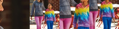 55% cotton/45% polyester • 6.43-oz. • burn-out washed pattern • ripped "V" front opening • knit gusset inserts • pouch pocket • dyed-to-match drawstring • cuffs and waistband • Sizes: S-2XL
