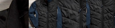 92% polyester/8% spandex bonded to 100% polyester micro-fleece lining • 9.1 oz. • 3-layer construction • water- and wind-resistant • comfort fit • contrast quilted front and back • bungee cord with toggles at bottom hem • zippered front pockets • hidden embroidery pocket for ease in decorating • contrast bungee zipper pulls • Sizes: S-4XL