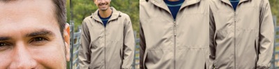 100% polyester • 2.5-oz. • wind- and water- resistant • two covered pockets with closure • attached hood with cord and bungee stopper • elastic cuffs • mesh-lined body and hood • inside utility/phone pocket • Sizes: S-4XL