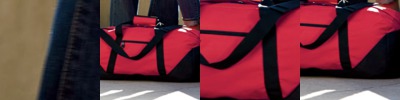 600-denier polyester • adjustable and detachable black strap • top and side grip handles • zippered front pocket • Sizes: 18"w x 10"h x 7.5"d