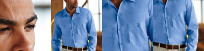 65% polyester/35% cotton • 4.25-oz. • permanent-press poplin • fade-resistant • lined two-piece collar with permanent stays and snap closure • mitered front pockets with pencil division on left pocket • Dickies logo on left pocket and bottom of button placket • industrial laundry friendly • Sizes: S-3XL